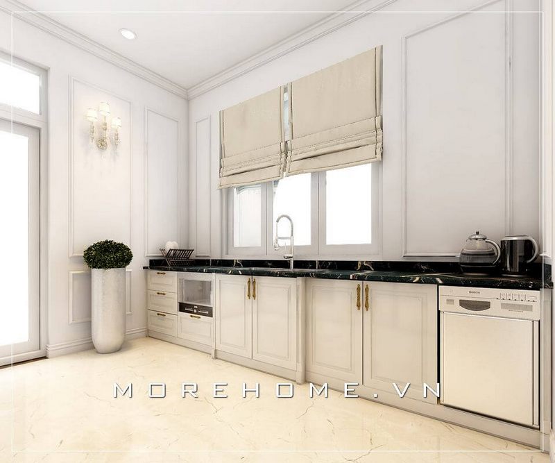Mẫu thiết kế bếp chung cư, biệt thự, nhà phố theo phong cách hiện đại có chút tân cổ điển của tủ bếp, không quá cầu kỳ nhưng thiết kế rất phù hợp với không gian căn nhà. Thiết kế tủ bếp có chút tân cổ điển gọn gàng cả tủ dưới bếp và tủ bếp ở phía trên bếp nấu, tất cả đều ngăn nắp và rất tiện nghi.