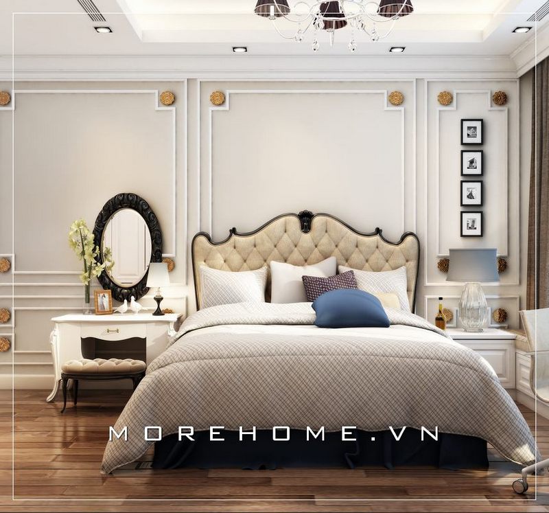 Giường ngủ gỗ tự nhiên cao cấp với phần đầu giường bọc nỉ sang trọng sẽ làm nên điểm nhấn hoàn mĩ cho không gian phòng ngủ của gia chủ.