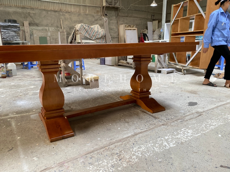 Thi công một bàn ăn hình chữ nhật có chân trụ giữa và diện tích bề mặt rộng rãi, 4 góc vuông tạo sự vuông vắn phù hợp với nhu cầu của gia đình có nhiều thành viên và có trẻ nhỏ. Bàn ăn được làm bằng gỗ tự nhiên.